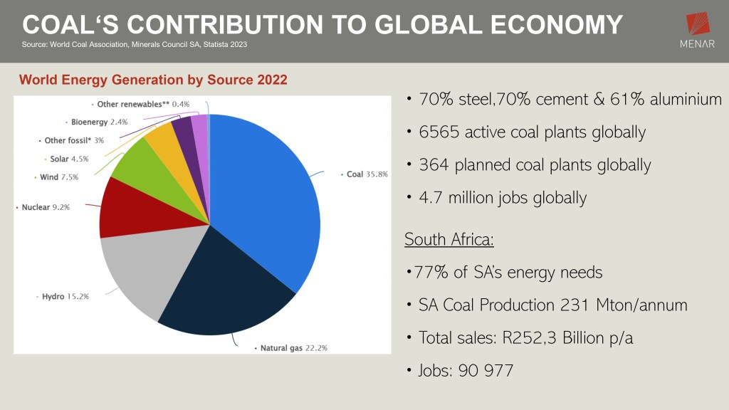 Coal’s significant contribution to the economy cannot be ignored, with an estimated 4,7 million jobs created globally and more than 90 000 in SA alone. The narrative that coal is bad, ignores the plight of the 600 million people in sub-Saharan Africa struggling to access electricity in favour of a costly renewables overhaul.