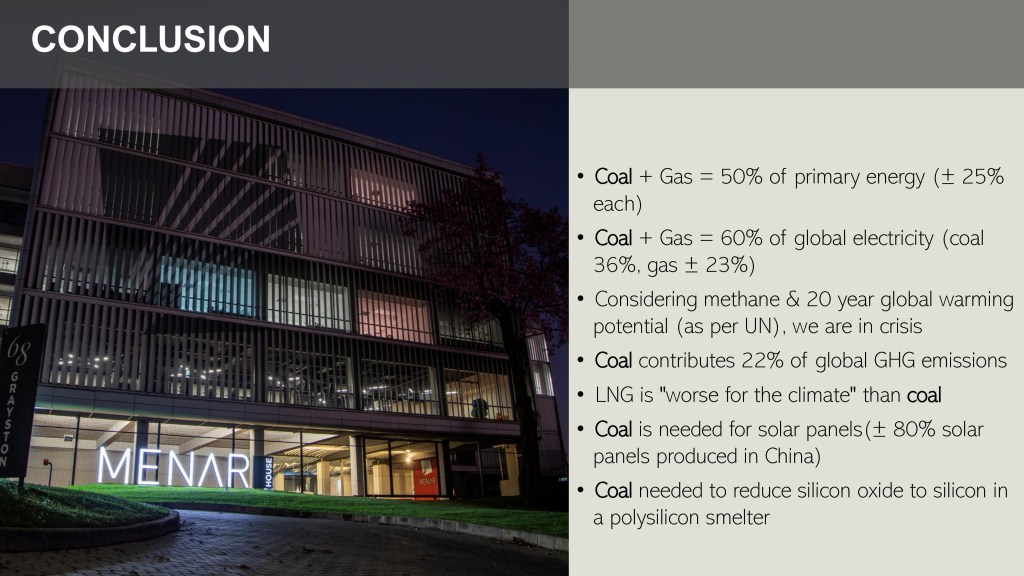 I pointed out that closing more coal fired power stations in South Africa would be a mistake. Komati power station was closed and replaced with solar to provide power for 25% of the day which is not enough.