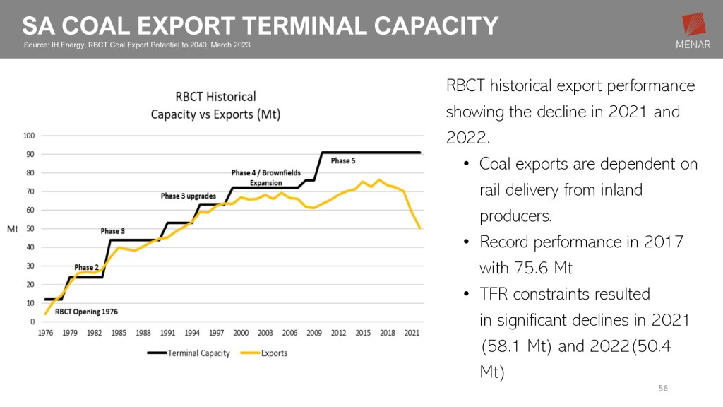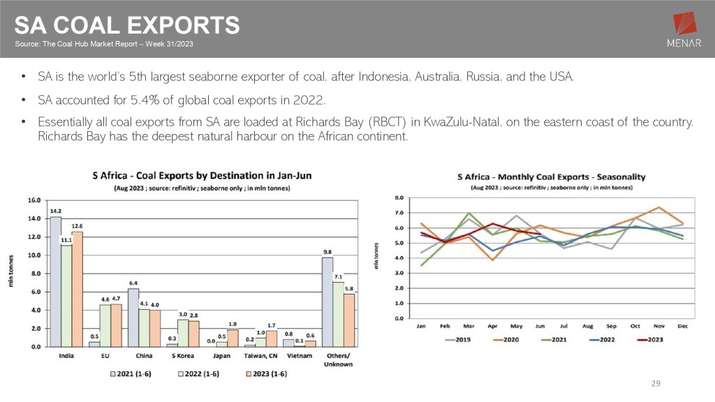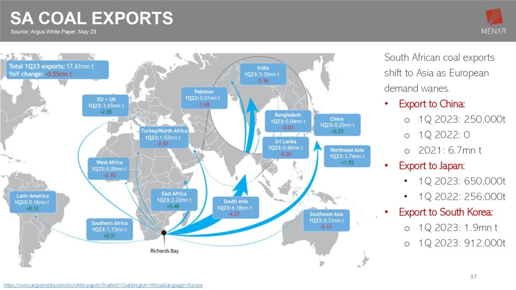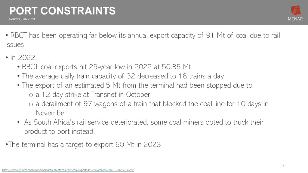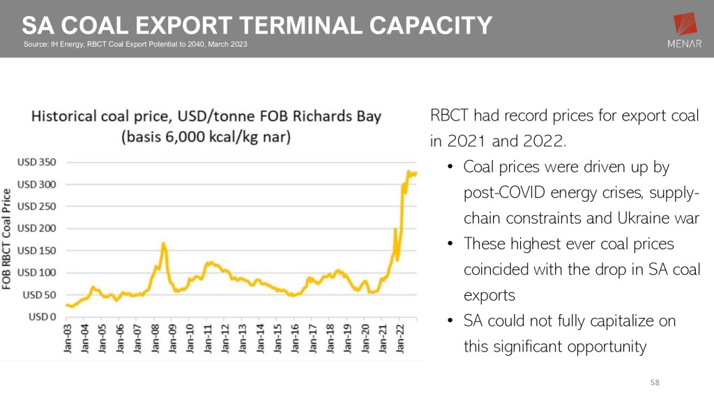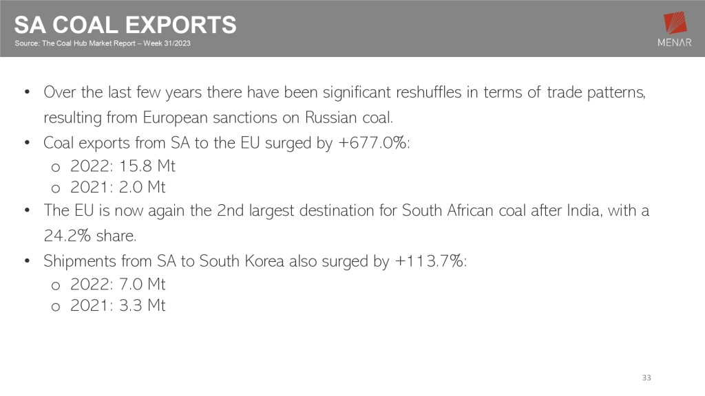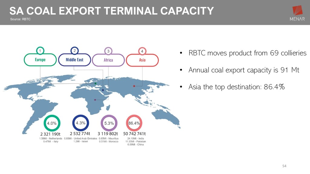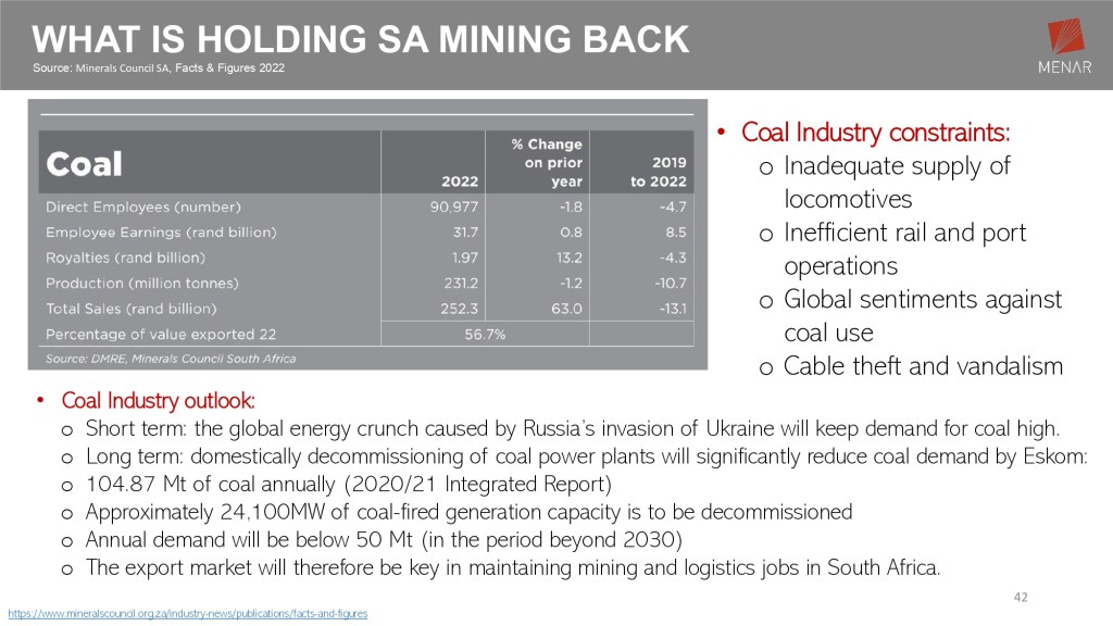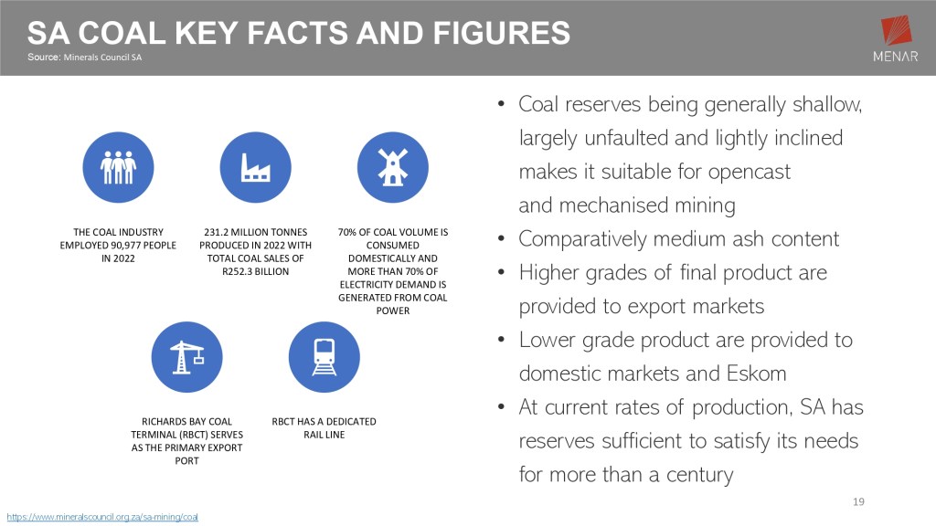 Current global coal mining activities reflect that 398 projects and 1800 MT of new mines are under consideration worldwide with Asian countries accounting for about 2/3 of projects in planning. Most of these projects are being developed in countries like China and India. China’s coal demand is projected to increase by 3,5% and India by 5%, while Indonesia will remain the world’s 5th biggest consumer of coal in 2023. Meanwhile, rail constraints have cost the country close to R353 billion in exports losses this year, with RBCT performing below its 91 MT capacity. Once these challenges are resolved, South African coal producers will be able to take full advantage of export opportunities that are opening up.