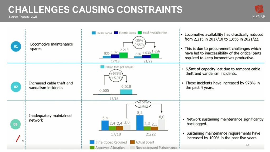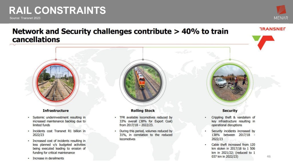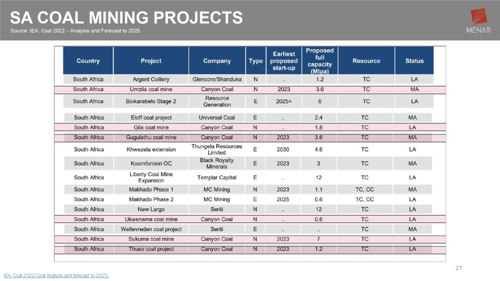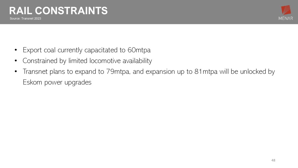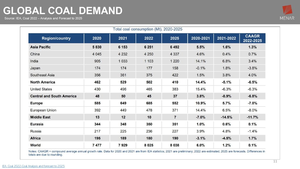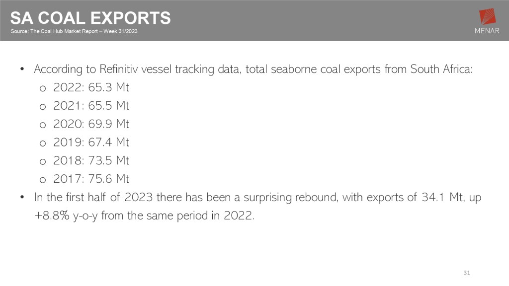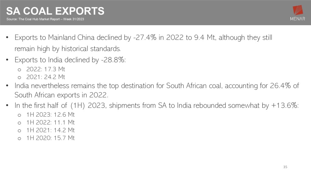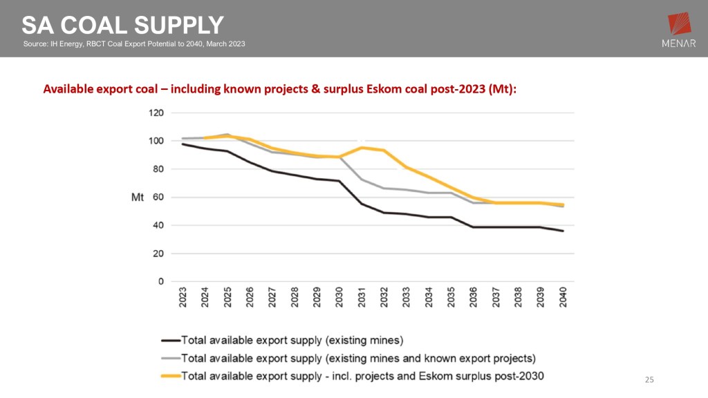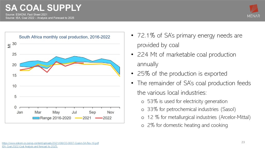 Current global coal mining activities reflect that 398 projects and 1800 MT of new mines are under consideration worldwide with Asian countries accounting for about 2/3 of projects in planning. Most of these projects are being developed in countries like China and India. China’s coal demand is projected to increase by 3,5% and India by 5%, while Indonesia will remain the world’s 5th biggest consumer of coal in 2023. Meanwhile, rail constraints have cost the country close to R353 billion in exports losses this year, with RBCT performing below its 91 MT capacity. Once these challenges are resolved, South African coal producers will be able to take full advantage of export opportunities that are opening up.