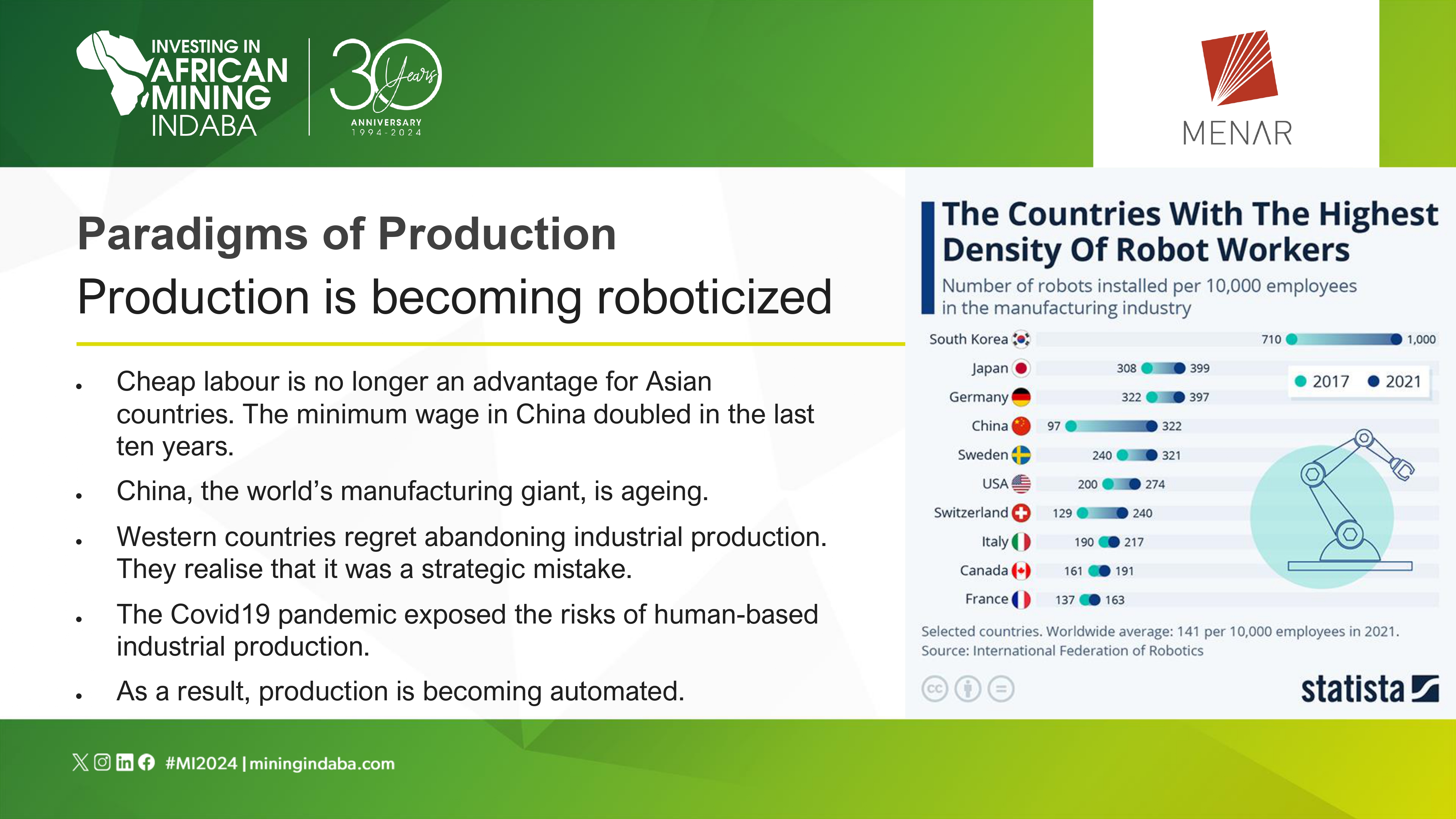 I opened the session by outlining the paradigm shifts in the global energy sector, pointing out that manufacturing is becoming increasingly automated due to 4IR. Machines, in some instances, have replaced humans. The world’s manufacturing giant, China, can no longer rely on cheap labour while its workforce is ageing. This has resulted in labour shortages, making automation an attractive option to keep the industrial value chain viable.