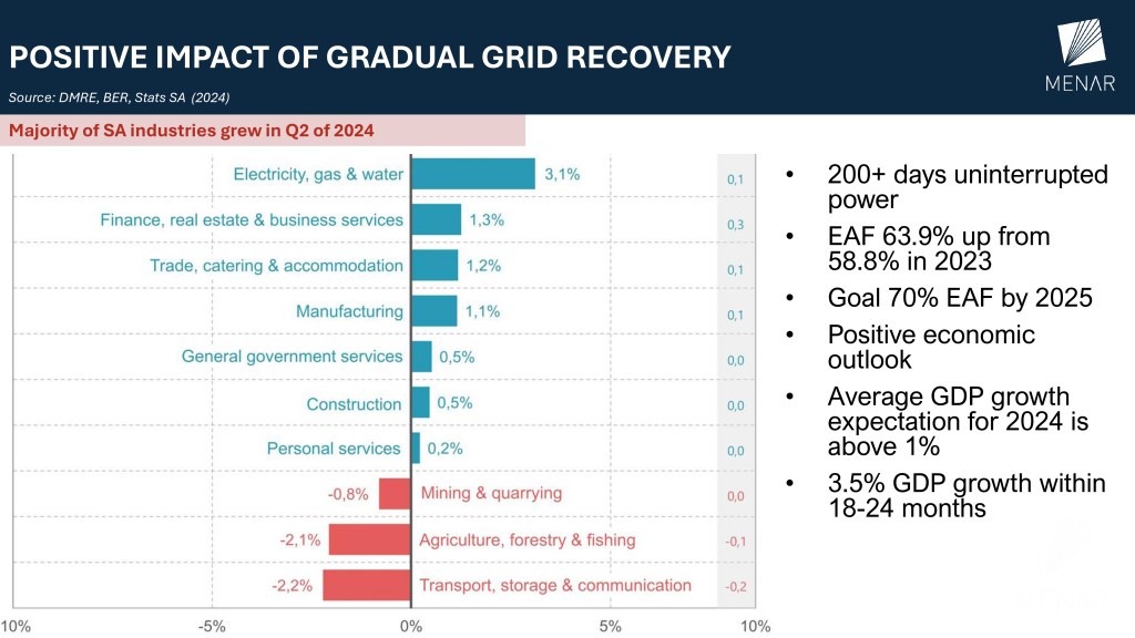 Demand is projected to grow by at least 3.4%, with 4IR technologies like data centers and AI creating a need for more electricity. Given these dynamics, the world needs to figure out a way to keep fossil fuels like coal in the picture for baseload production. Improvements in Eskom’s performance have given the SA economy a more positive outlook. Some experts anticipate a GDP growth of over 3% within the next 2 years.